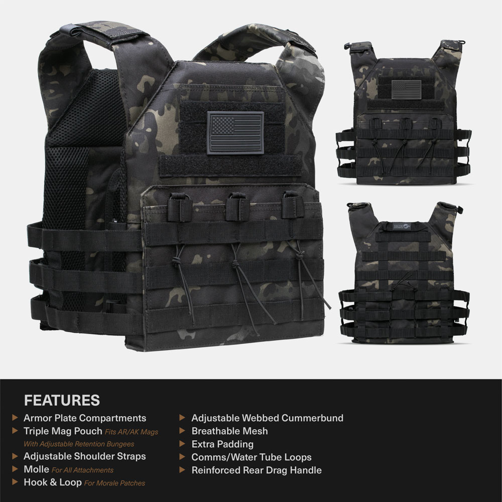 The BattleVest V2 plate carrier has been designed with a plethora of features typically found on high priced carriers at a fraction of the cost. The now classic skeletonized cummerbund offers unrivaled breathability while maintaining a rigid inner lining to ensure structural integrity when adding gear to the MOLLE webbing. The front and back plate compartments will accommodate both 10×12 Plates and press comfortably against your body using a breathable mesh material. The front panel on the carrier has 3 integral magazine pouches designed for AR15 and AK47 magazines. The pouches sit flush when not in use and will not interfere should you want to add alternate pouches to the front MOLLE panel. Both the shoulder straps and cummerbund are fully adjustable allowing the carrier to fit both small and large framed individuals. The MOLLE sections can be found on the front, sides, and rear of the carrier offering 360 degrees of optional attachment points. Our shoulder straps also come integrated with cable management loops for your hydration and communication needs or wants. Lastly, we are offering this carrier with a reinforced rear drag handle ensuring you can get your hefty teammate off the X quickly without worrying about the carrier being structurally compromised.